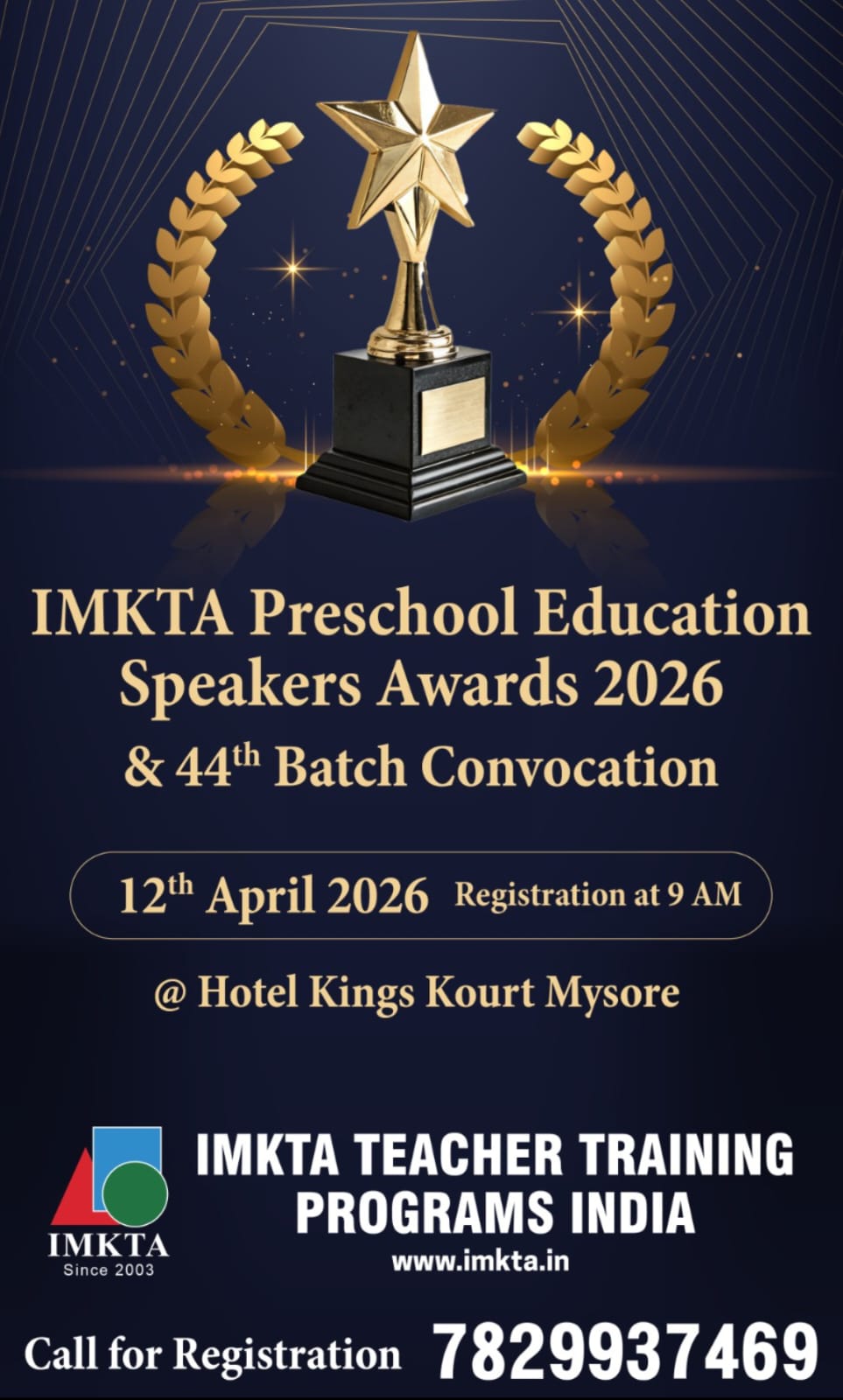 International Montessori and kindergarten training academy (IMKTA) is the premier preschool teacher training institute offering Diploma Montessori and Kindergarten method of education for aspiring parents, teachers and to those interested in early child care and education, IMKTA offers courses in the regular, distant learning course with contact programs and practical workshops. IMKTA also provides consultancy services to preschools which need improvements and to strive towards greater excellence. IMKTA also supplies Montessori materials, and Montessori books and albums. The placements cell of the IMKTA helps the Montessorians to find jobs both in India and Abroad.